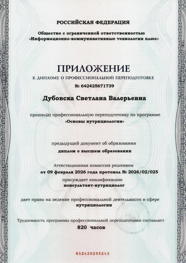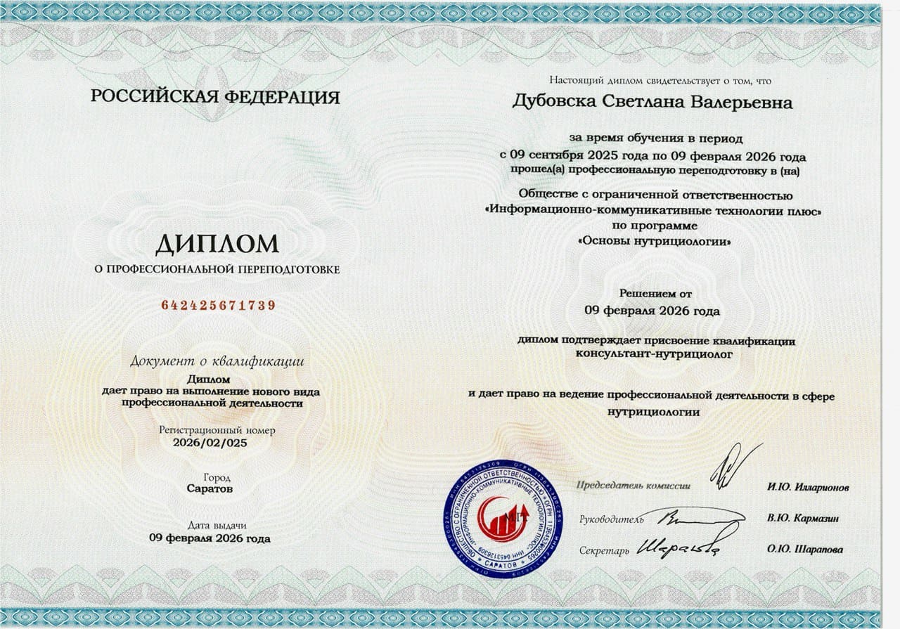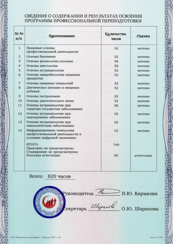 Program profesionalne prekvalifikacije „OSNOVE NUTRICIOLOGIJE“, 820 sati – Saratov, Rusija